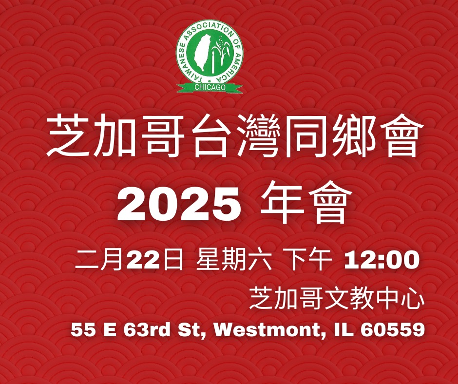 同鄉會2025年會將於二月22日星期六下午12:00,於芝加哥文教中心舉行,理事會已經全力籌備中。