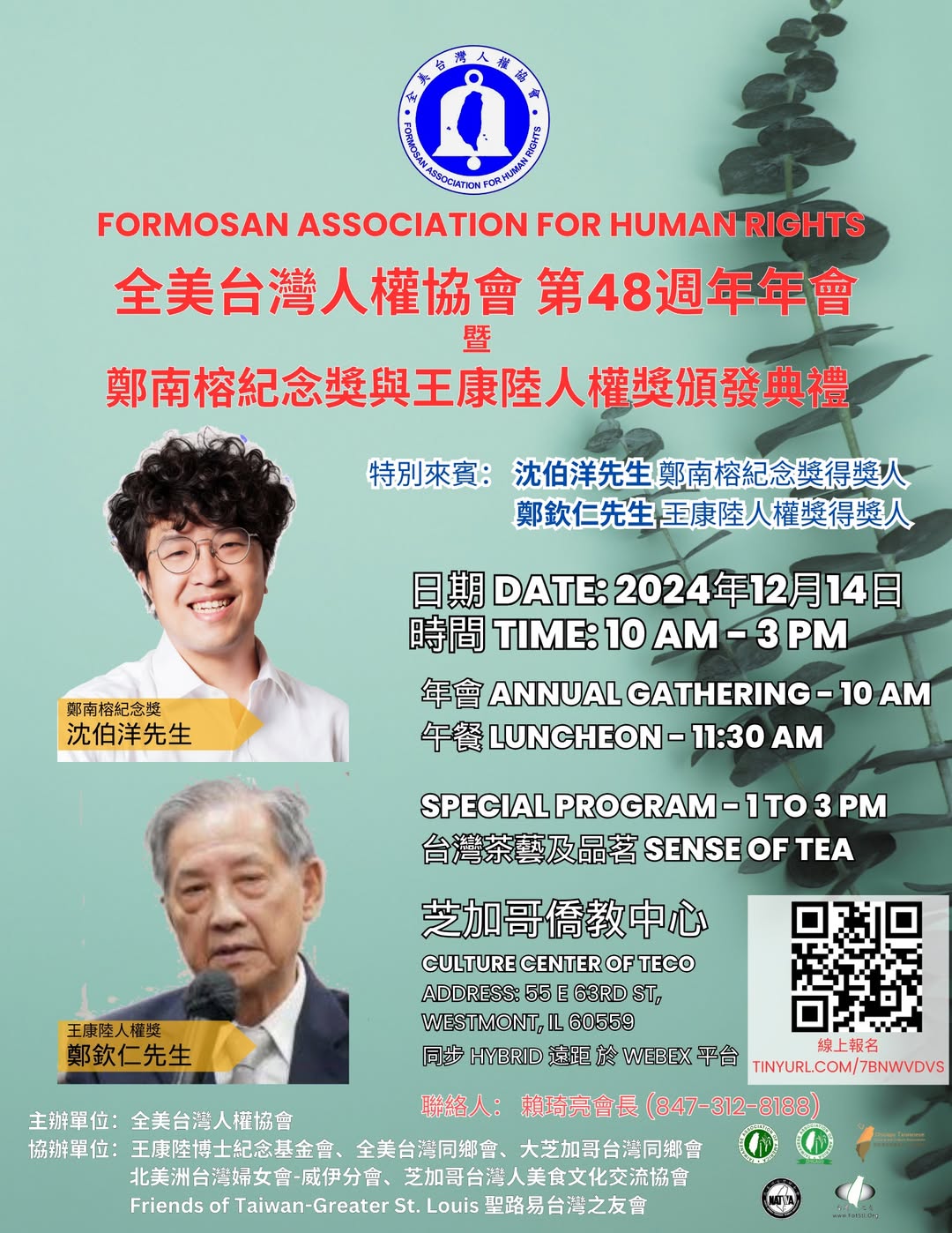 全美台灣人權協會 2024 第48屆年會 暨 人權獎大會 時間:十二月14日 星期六 上午 10 點 到下午 3 點 地點:芝加哥文教中心 Culture Center of TECO Address: 55 E 63rd St, Westmont, IL 60559