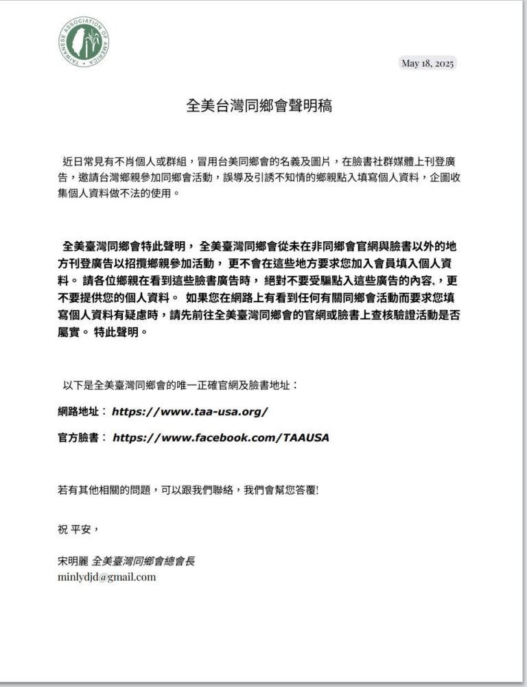 警惕假冒臺灣同鄉會帳號,勿被盜用照片與虛假名稱所騙。請認明大芝加哥臺灣同鄉會官方頁面。