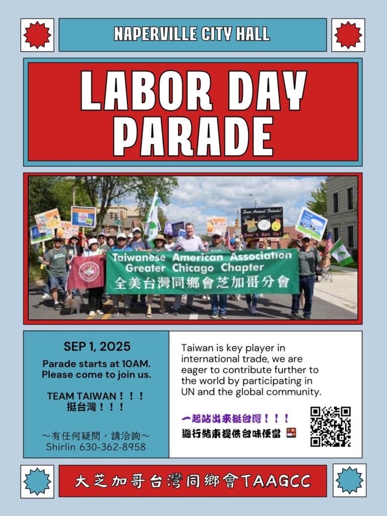 即將截止!邀請鄉親報名9月1日Naperville勞工節遊行活動,一起支持台灣。