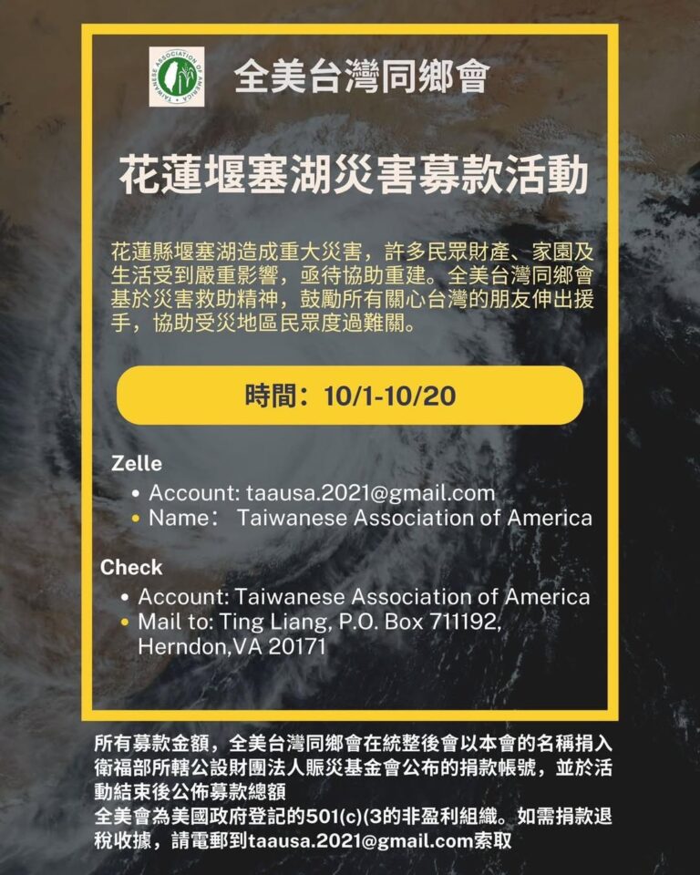 超級颱風重創花蓮,堰塞湖災情嚴重。全美同鄉會呼籲支持捐款花蓮賑災專案,陪伴災民重建家園。