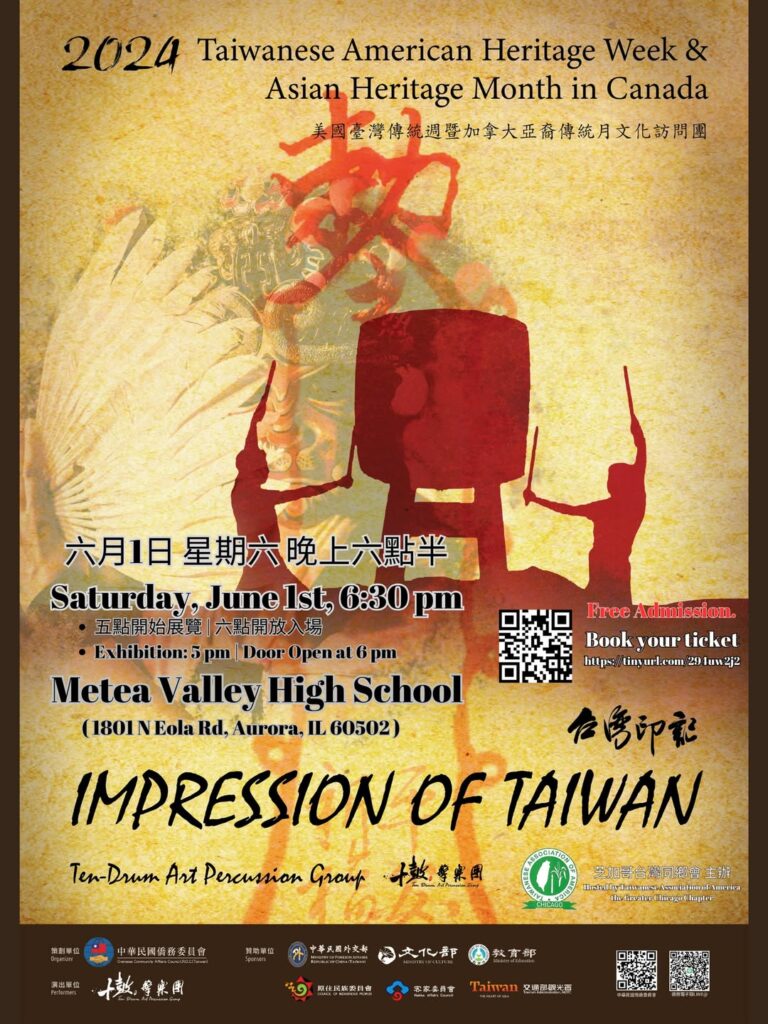 台灣傳統週《台灣印象》音樂會,6月1日在伊州Metea Valley High School舉辦,由獲獎擊樂團十鼓演出,免費入場。